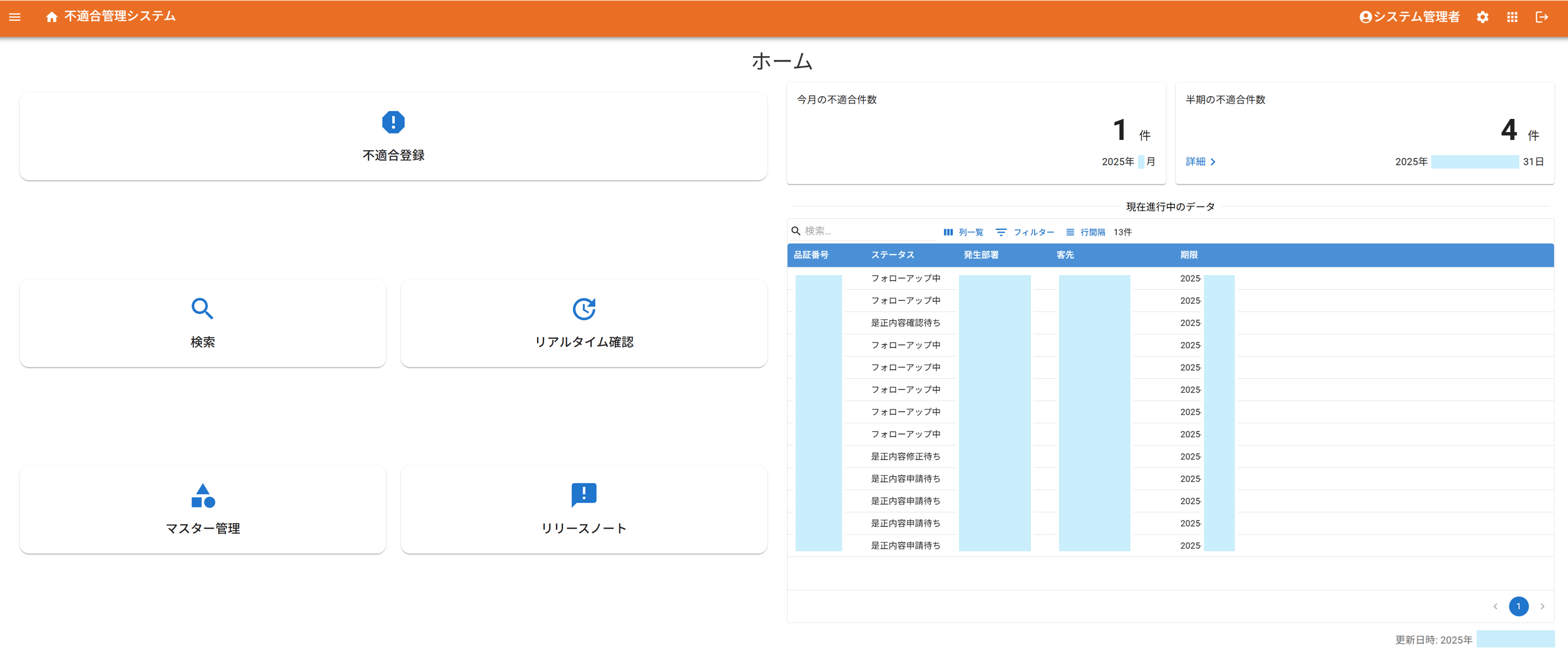 山梨県にある製造業のお客様向けに、不適合管理システムの開発を担当しました。本システムは、製造現場で発生した不適合をリアルタイムで把握・管理し、原因や対応履歴を一元化することを可能にします。情報の可視化により再発防止や改善活動を促進し、生産性向上とコスト削減につながる、製造プロセスの最適化を実現しました。詳細についてご興味のある方は、ぜひご相談ください。